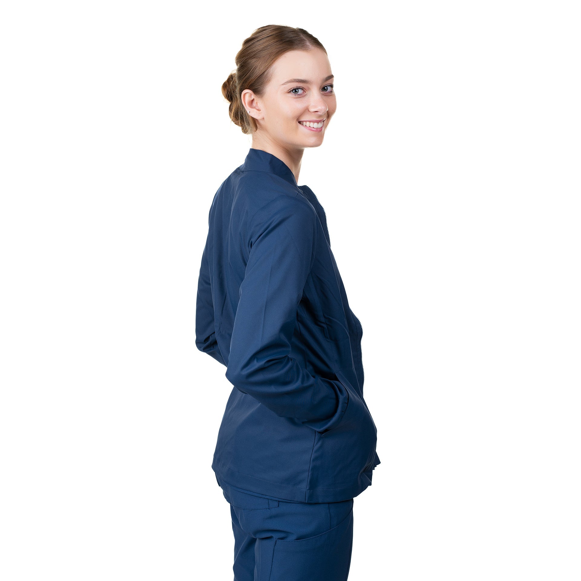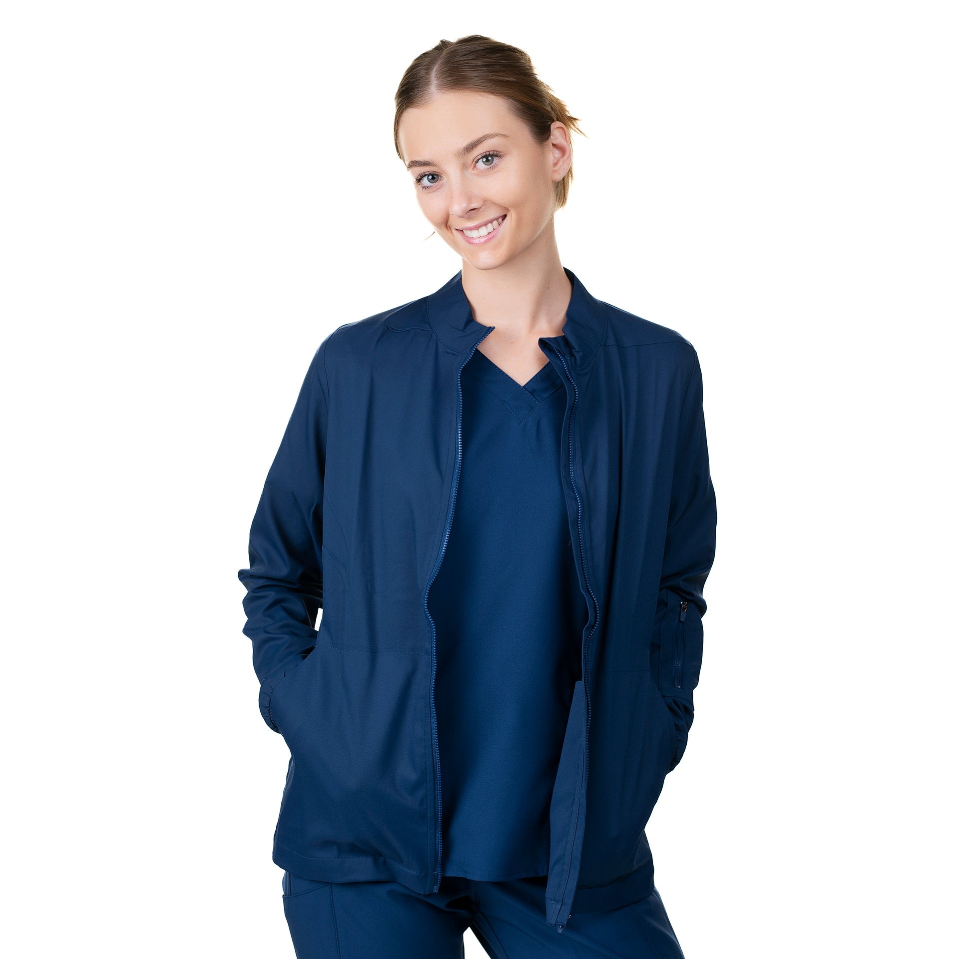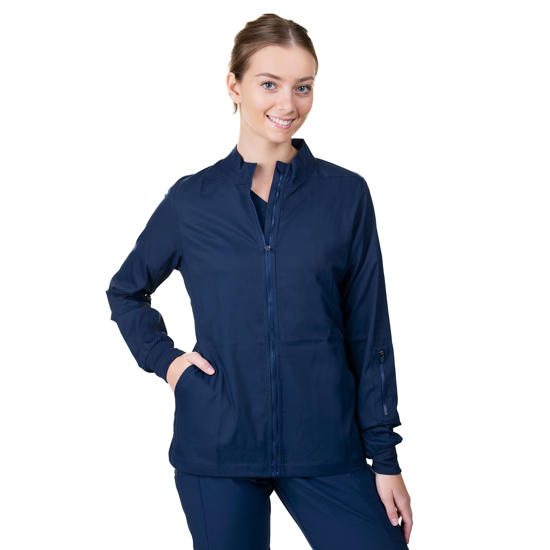 Layer it over your scrub top anytime you need additional comfort to stay warm, focused and feeling good. It also delivers an extra place to store tools and essentials while your fast-paced shift moves along. Two front pockets let you warm your hands or keep must-haves by your side, while one sleeve card pocket with a zipper secures smaller items. Hold your tablet in a generous pocket on the inside, designed to provide hands-free mobility as you're editing patient charts or preparing for appointments. The full-zip front is all about versatility, giving you options when temperatures fluctuate from room to room. Ribbed cuffs draw the silhouette in for a modern profile that stays cozy. Because when you're comfortable, you're able to do your best work.